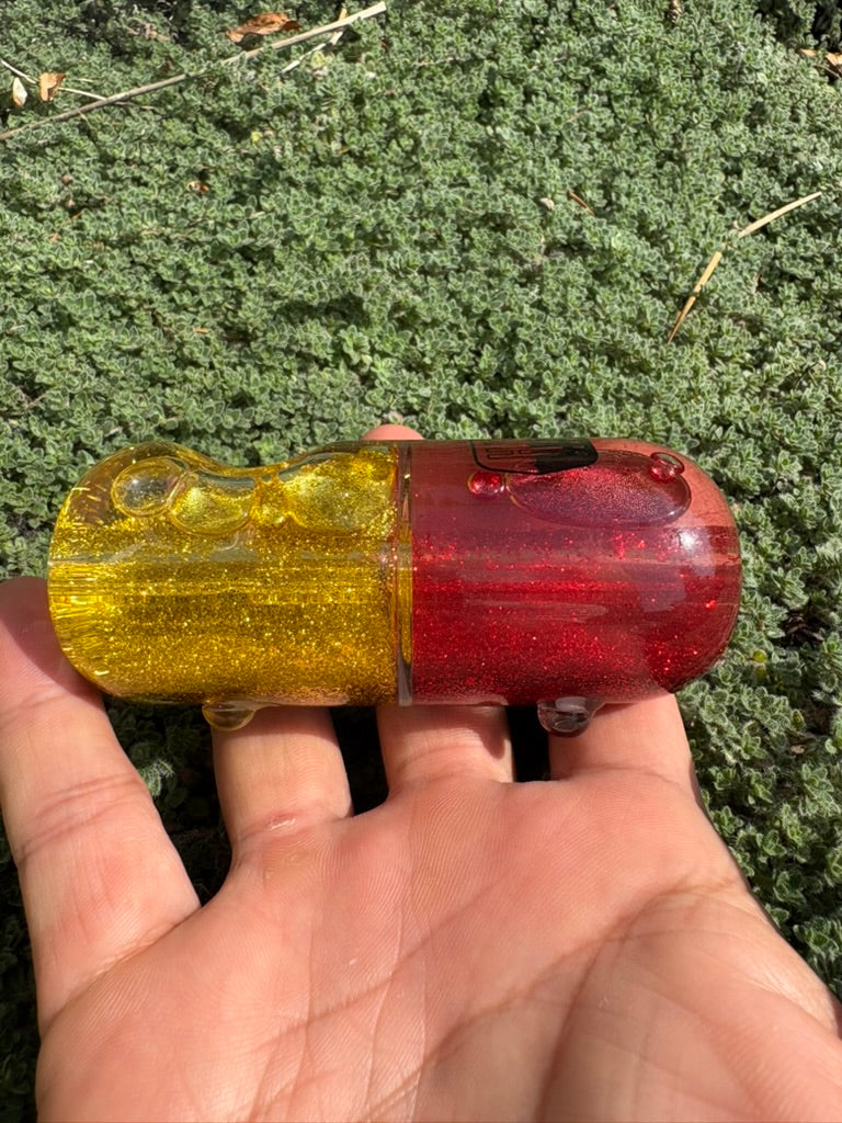Step into the future of smoking with the Cherry Red Time Capsulee, a brand-new glitter pipe style from Hitide Glassworks. This double-walled glass design features two separate chambers, allowing you to load up with two different glitter colors in one stunning piece. Watch as the colors swirl and shift in mesmerizing motion every time you pick it up.